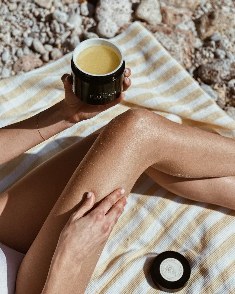 Refillable olive oil balm gently exfoliates and nourishes with vitamins C, E, and A for smoother, brighter, hydrated skin.