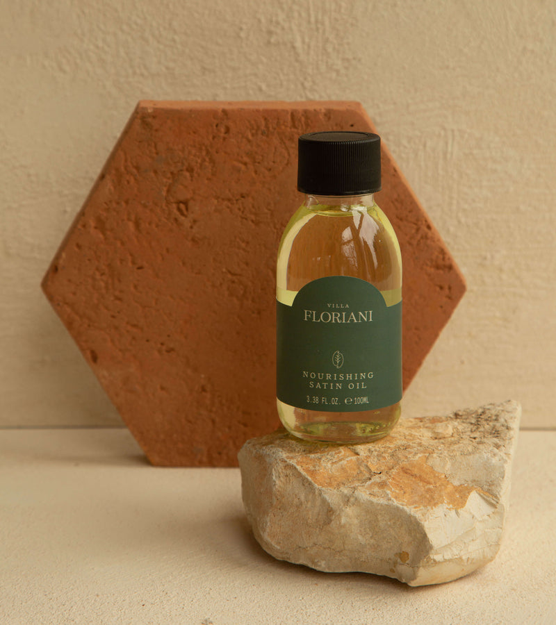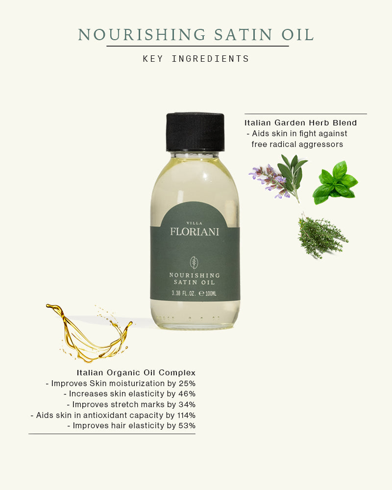 The abundant benefits of olive oil are no secret to Italians, and our deeply nourishing, rejuvenating satin oil brings the very finest handpicked oils from the sweeping hills of Italy to you skin. Quick-absorbing and suitable for all skin types, cold-pressed organic olive, almond, linseed and borage oils rejuvenate dry, dehydrated skin, while aromatic garden herb extracts rosemary, sage and thyme strengthen and protect. For strong, plump, silky-smooth skin, so radiant it glows.